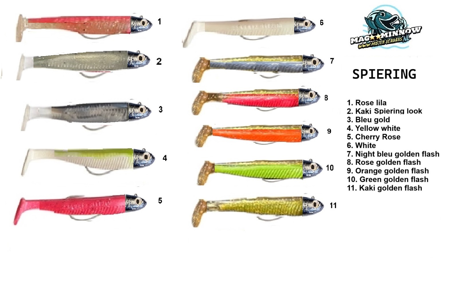 NR.1 GHOST, NR.2 REAL EEL, NR.3 PINK GOLD, NR.4 PINK ZILVER FLASH, NR.5 PINKY, NR.6 WHITE, NR.7 PEACH, NR.8 BLACK SALTY, NR.9 FLUOR YELLOW, NR.10 KAKI